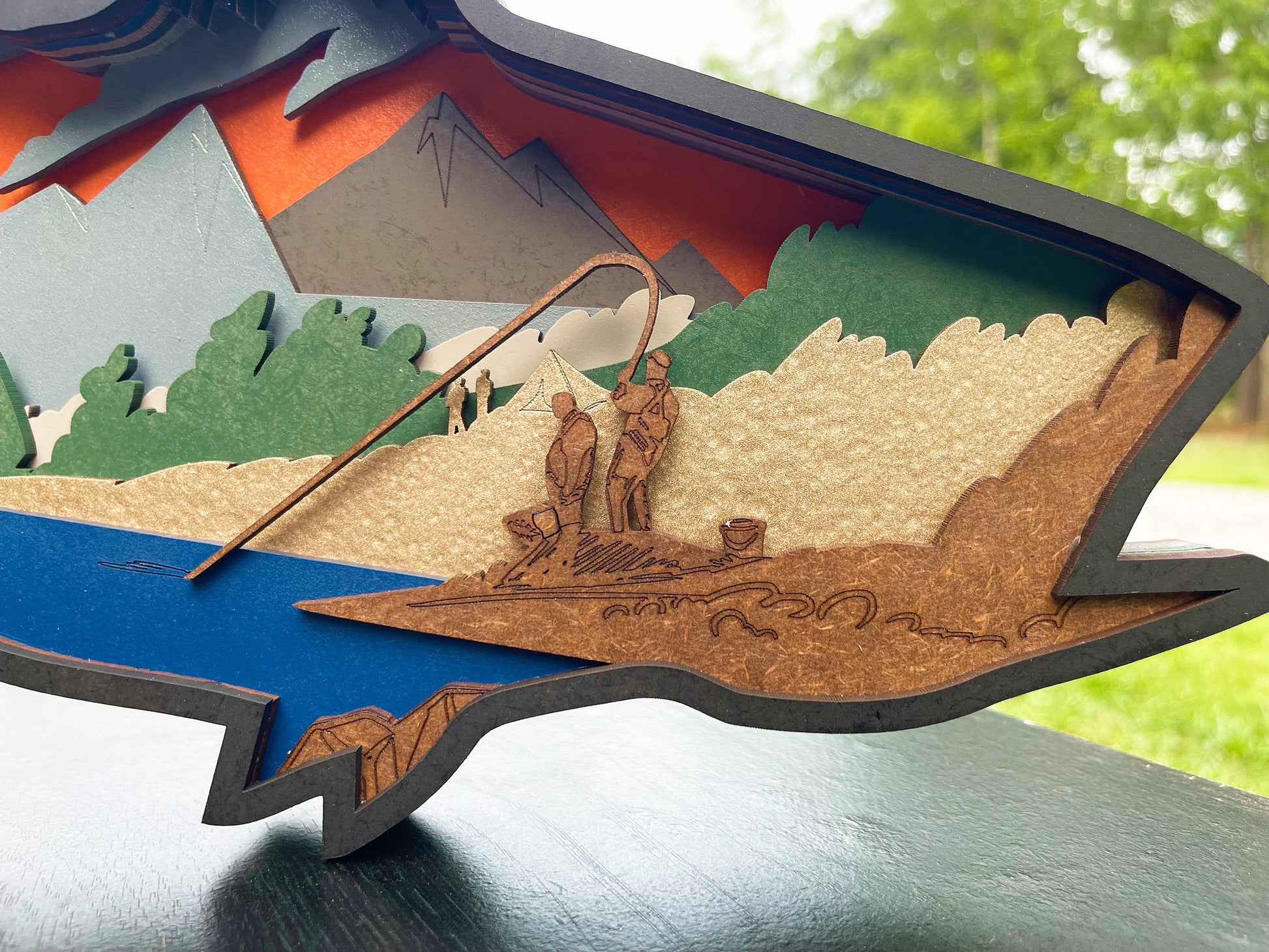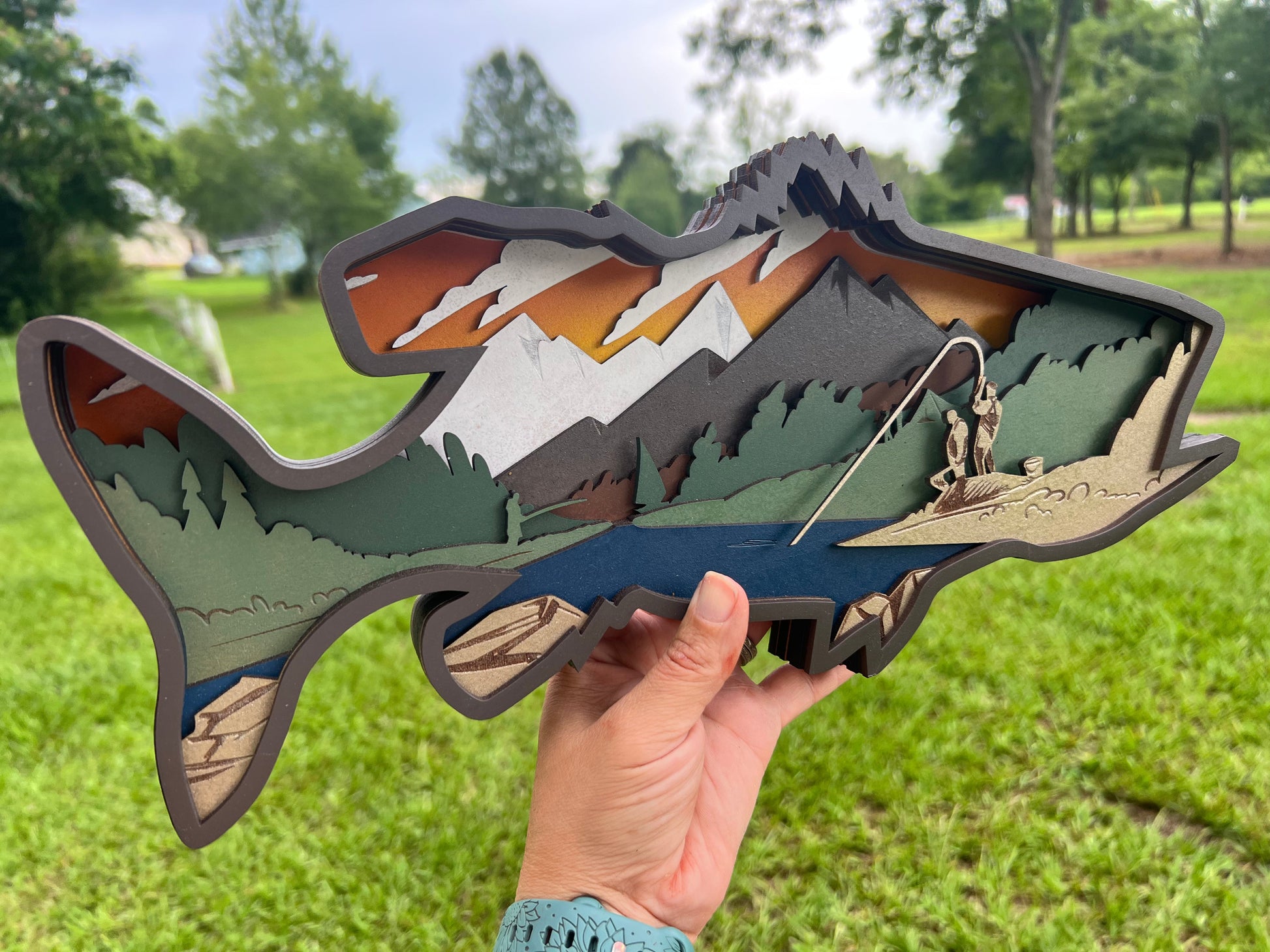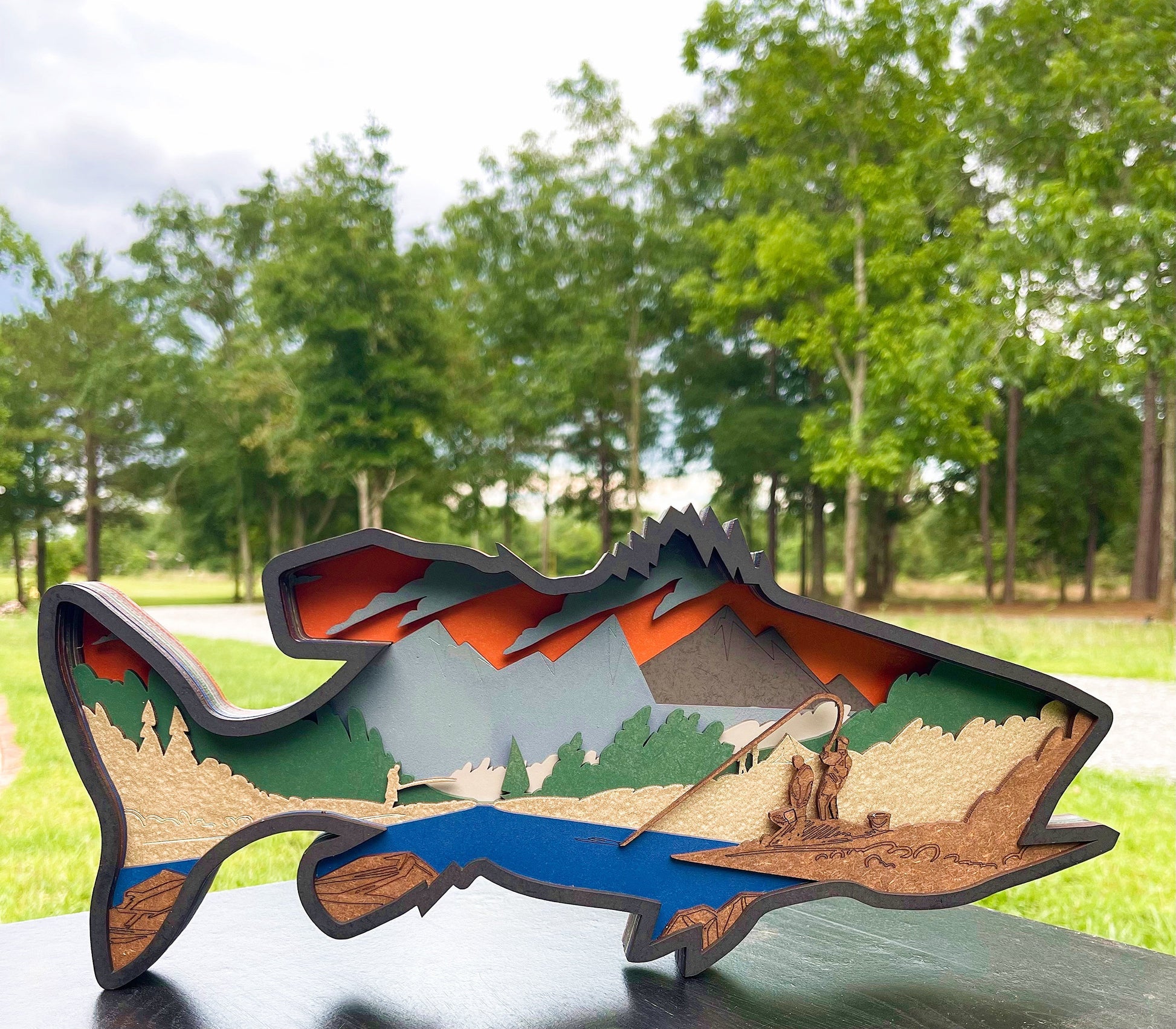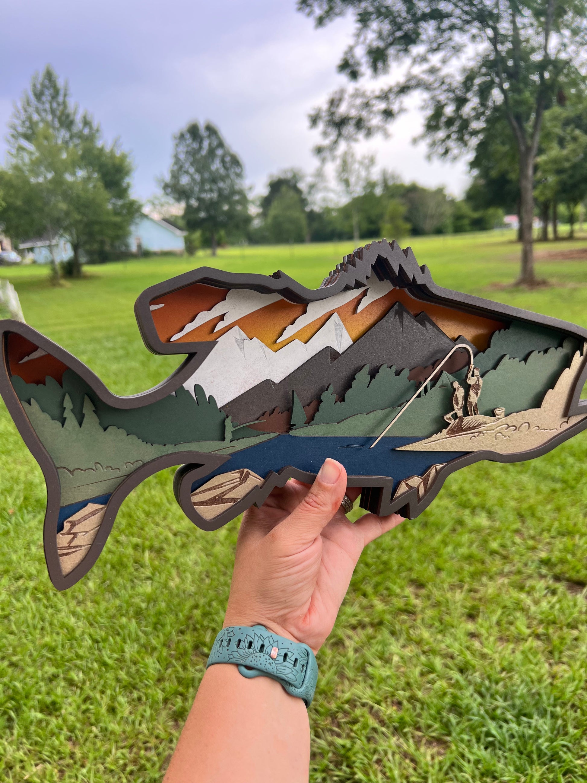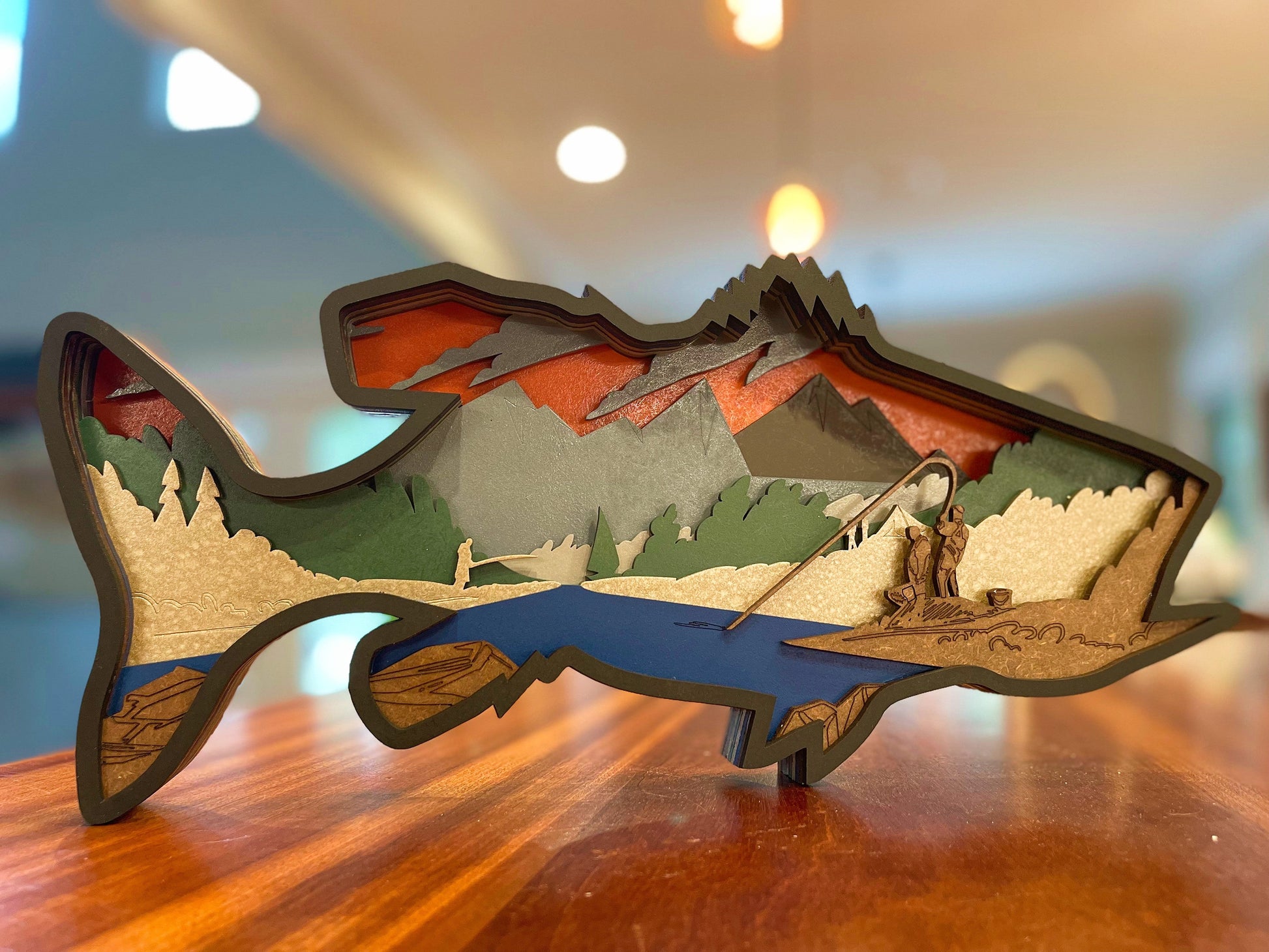 Give a one-of-a-kind gift with this unique 9 layer fish mandala. Its intricate cuts layer together to create a captivating story, making it the perfect addition to any fishing enthusiast's office, workspace, or shop. Its special features provide a unique and lasting gift.