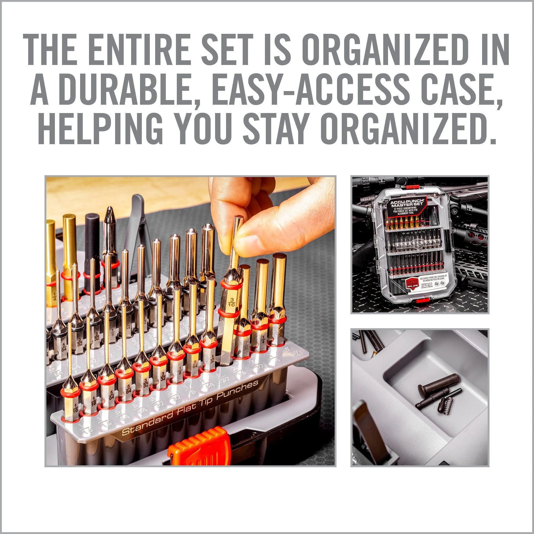 All punches are clearly labeled. Rubber o-ring ensures a secure grip, prevents slippage and reduces the risk of marring. The entire set is organized in a durable, easy-access case, helping you stay organized and eliminate clutter on your gunsmithing bench. and making it easy to access all the tools.