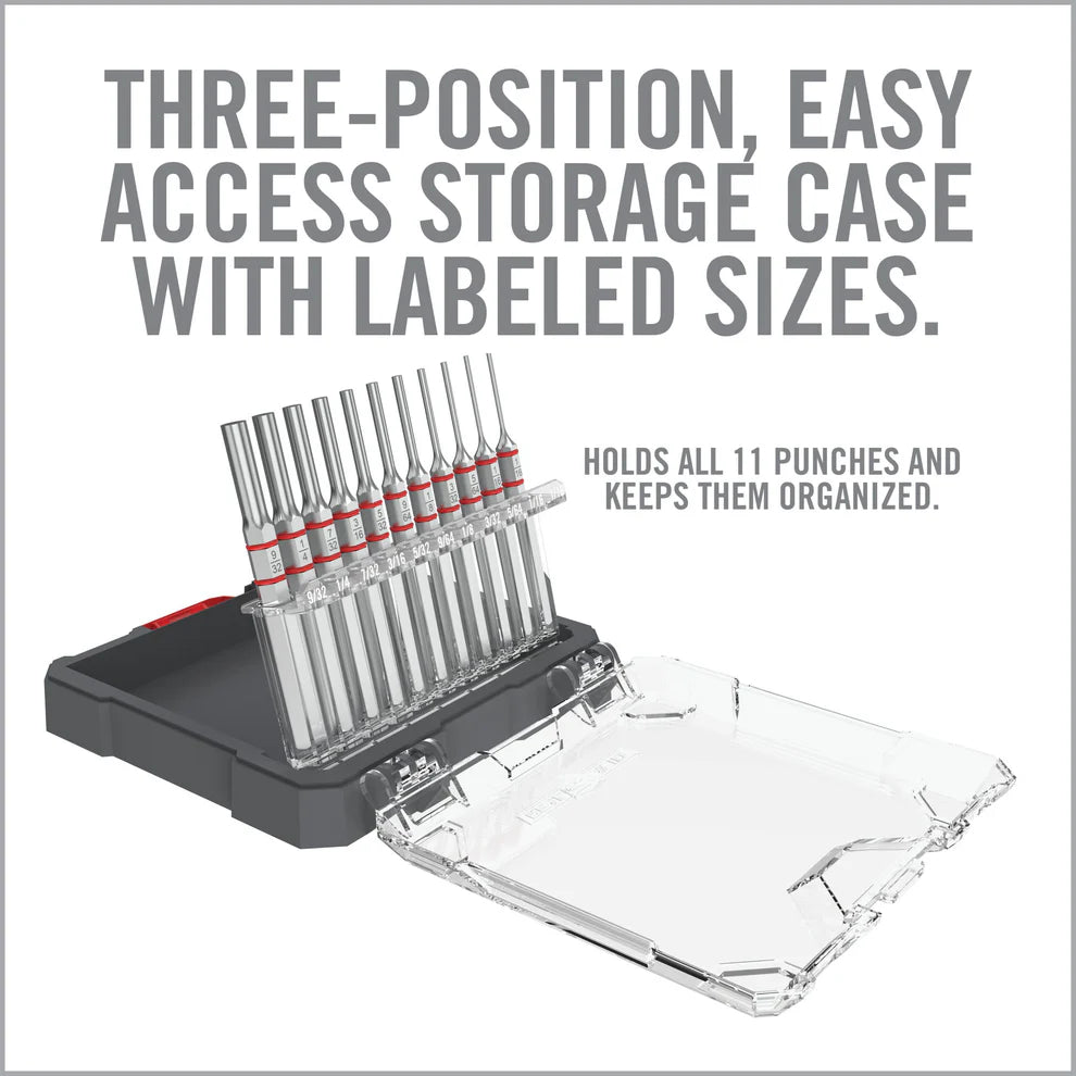 - Accu-Punch 11-Piece Standard Pin Punch Set includes 11 standard pin punch sizes for versatility