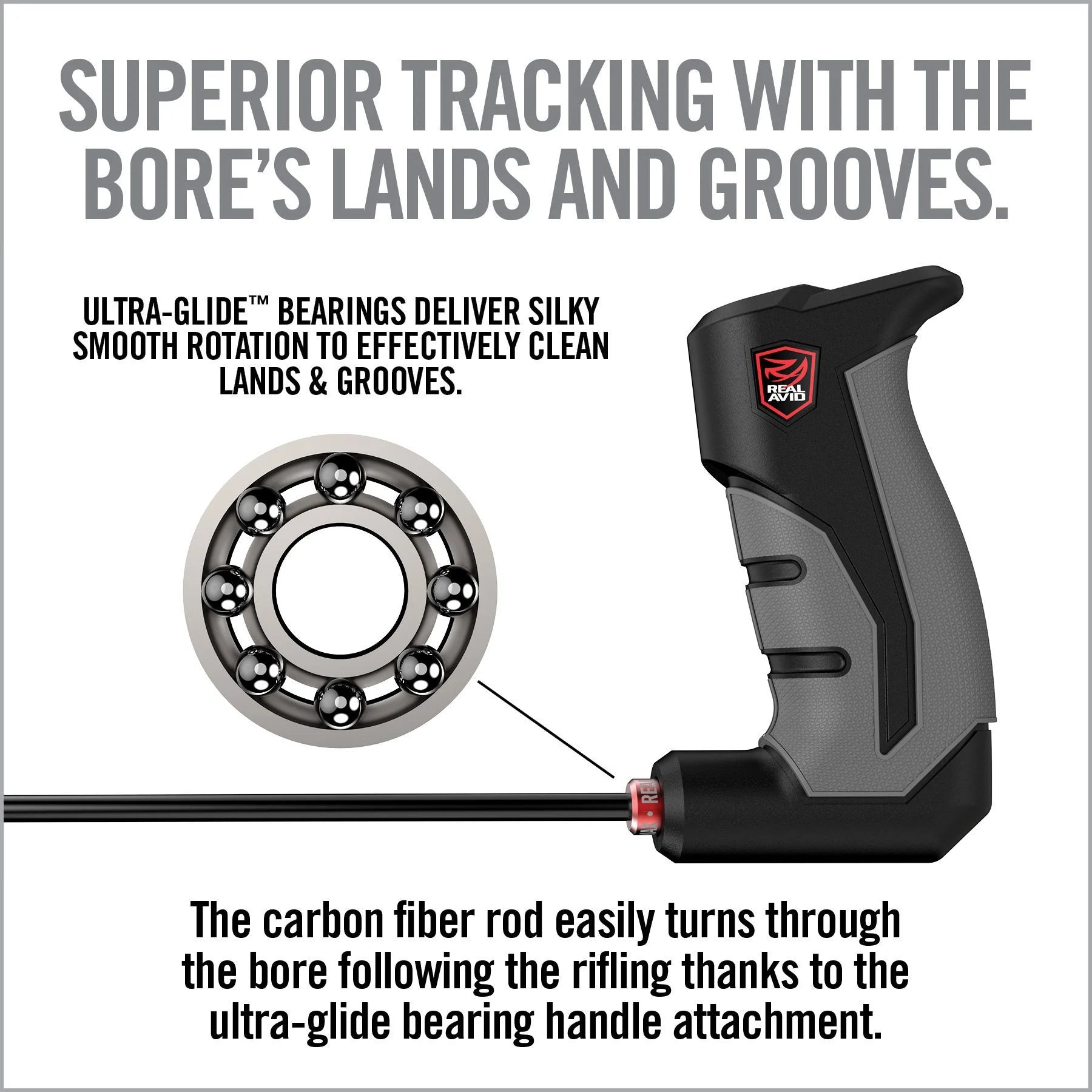 Upgraded comfort grip made for pushing and pulling jags, patches and brushes through the bore. Easier on your wrist and hands due to the vertical grip versus traditional horizontal screwdriver grips commonly found on other cleaning rods which are designed for tuning, not pushing and pulling. The premium carbon fiber rod easily turns through the bore following the rifling thanks to the ultra-glide bearing. The ultra-glide bearing provides smooth rotation through the bore to effectively follow and clean lands and grooves. Included with the Smart Rod is a wall hanger storage bracket that cradles the handle and lets the rod hang vertically to prevent deformation and damage.