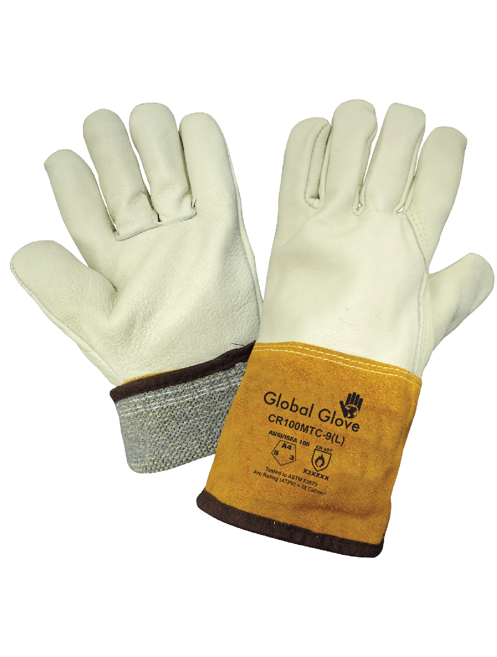 These cut-resistant, heat-resistant, and flame-resistant, premium grain cowhide leather welding gloves feature an Aralene® (enhanced aramid fiber) cut-resistant inner liner, which provides cut-resistant and heat-resistant properties. The split cowhide leather gauntlet cuff is 4-inches long for extra forearm protection. It is sewn with aramid fiber for added heat protection and includes a wing thumb for comfort and ease of grip.
