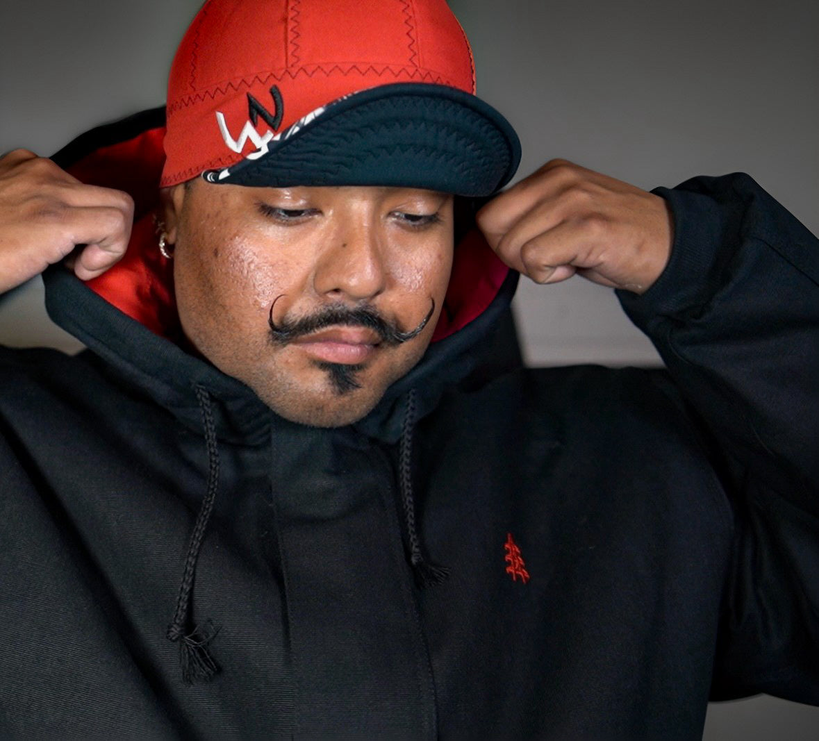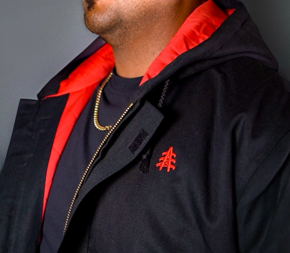 It's made from heavyweight cotton FR duck that's insulated for extra warmth, with a quilt-lined hood with red diamond stitching inside and four total pockets inside and out.