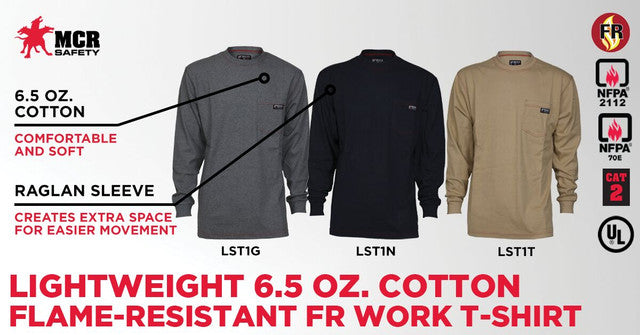 There is no rule stating that FR garments should be uncomfortable, so why are you uncomfortable in yours? MCR Safety's 100% FR cotton long sleeve t-shirts will insure your safety AND your comfort when flame resistant clothing is required on the job. Our LST1 series FR shirts feature a soft and lightweight 6.5 ounce cotton fabric that provides 10.6 cal/cm2 (CAT2) protection. Each one meets the NFPA 2112 Standard for Flame Resistant Garments and NFPA 70E Standard for Electrical Safety in the Workplace. All MCR Safety FR garments are UL Certified and have a lifetime FR guarantee.