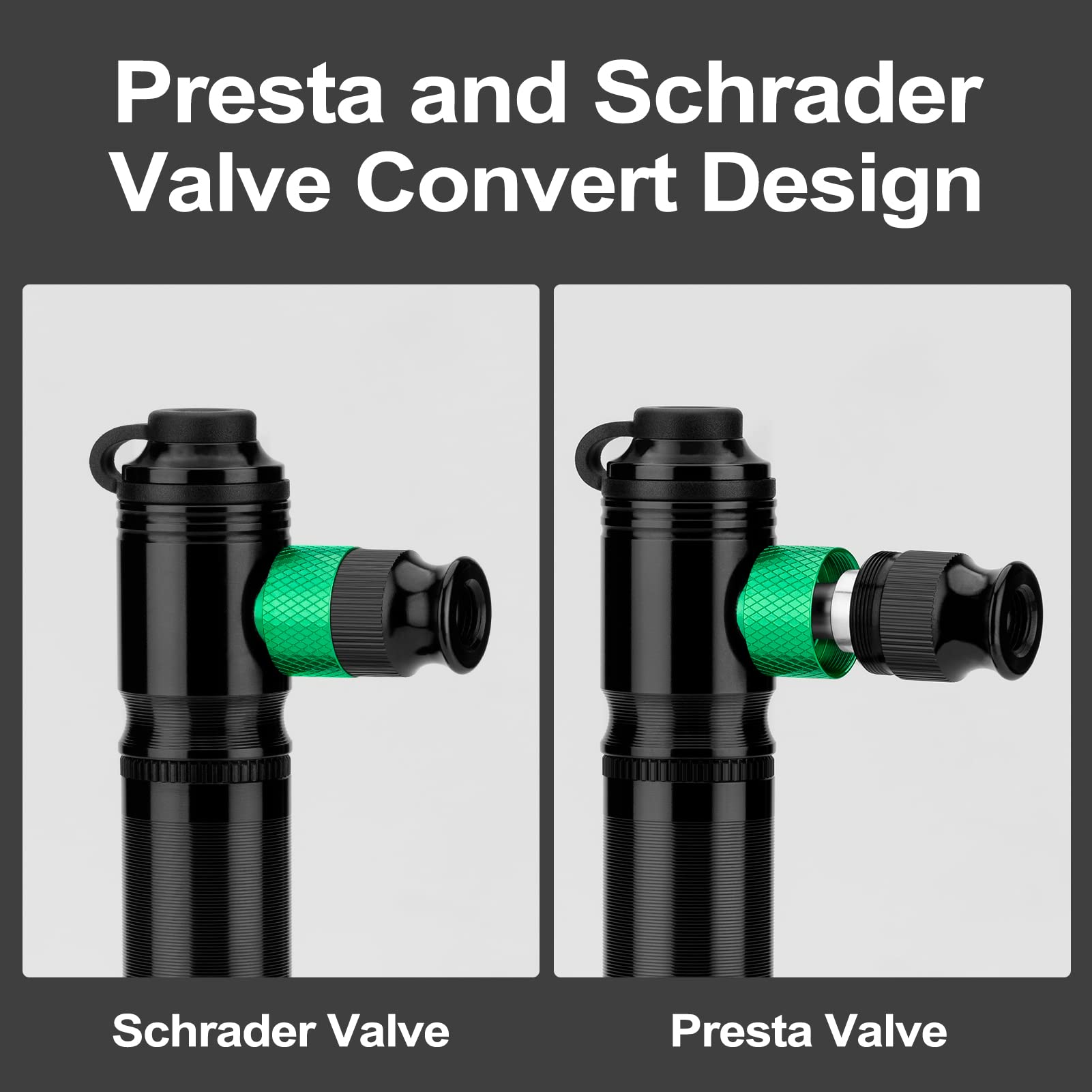 - 【Presta and Schrader Valve Convert Design】: The bike air pump has ingenious design works with Presta and Schrader valves. No matter you own mountain or road bikes, it’s a portable bike pump for all, and you don't have to carry a presta converter any longer.
