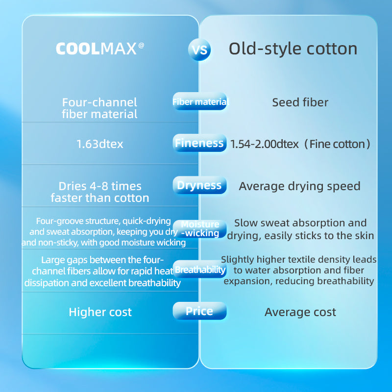 - COOLMAX Cooling Fiber – Advanced four-channel fiber for sweat-wicking, quick drying, and enhanced breathability.